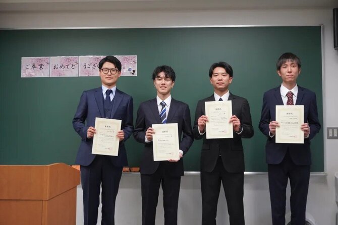- 浅井寛太氏(Φ研:M2)、内海秀介氏(TA研:M2)、木下史音氏(Y研:M2)、吉村風汰氏(B研:M2)が2025年度物理学教室修士論文講演賞を受賞しました。