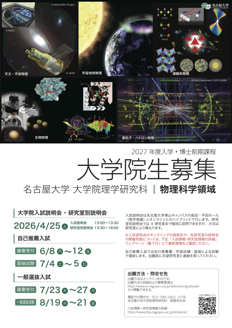 名古屋大学 大学院理学研究科 理学専攻 物理科学領域では、上記の日程で入試説明会を開く予定です。