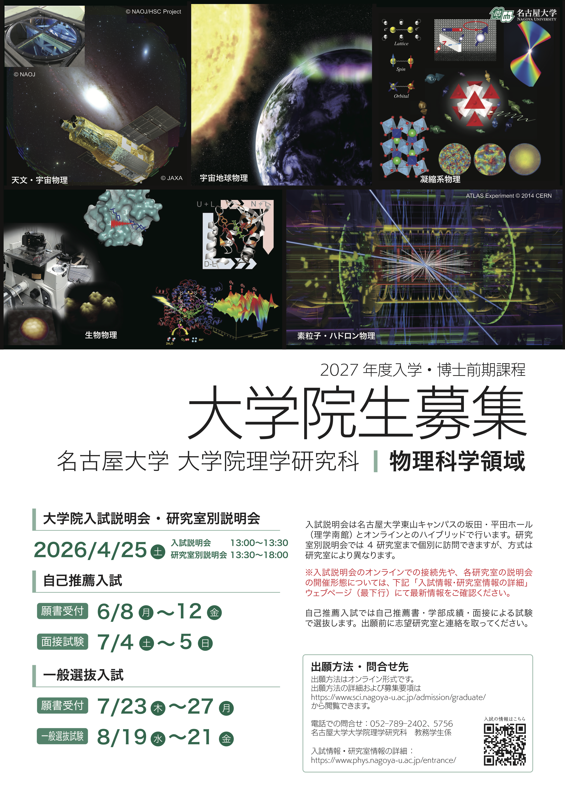 本ウェブページは名古屋大学大学院理学研究科 理学専攻 物理科学領域 の大学院入試情報のページです。理学専攻物理科学領域は、「物理学教室」と「宇宙地球環境研究所」で構成されます。
